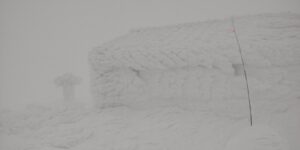 体力の様子を見ながら休み休み登る。約1100mの迷沢支流の横断ポイントで風が強くなり見通しが悪くなる。だいたい見通し50mくらいか。支流の源頭を左岸から右岸に横断し、右岸の尾根を登る。尾根の途中1400m地点で小休止。ここで風が強くなる1500mに行く前にゴーグル、ヘルメットを装着。10分休憩、その後尾根を登り1500mを越えていくと吹雪で視界は30mくらい。GPSをみてコンパスで方向をセットし、ここからコンパスと足元だけを見て避難小屋を目指す。風は後ろからくるのでまだ快適。逆に帰りに向かい風になるいつものイヤな風だ。進むと今回もラッキーなことに「しゃくなげの塔(プロペラの碑)」に会えた。ここから先は視界10m弱くらい。雪庇が怖いので牛歩で進む。しばらく歩いていると避難小屋が突然前に出現してくる。視界がないので白い世界から突然出現するのだ。今回もなんとか避難小屋に到着した。