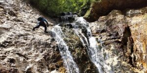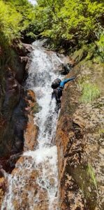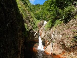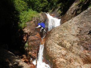 息をつくヒマがなく滝が連続してくる。F6(2段10m)は以前は手前の小滝から巻いたが今回は気温が高いことから水線を直登する。難しくはないが手前の小滝の水流で股間まで濡れてしまい個人的にがっかり。