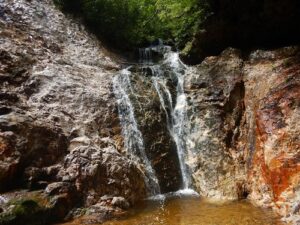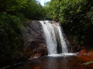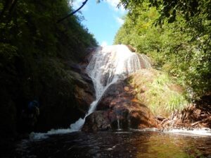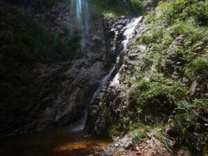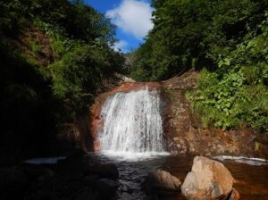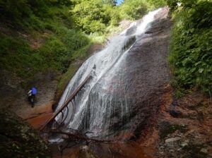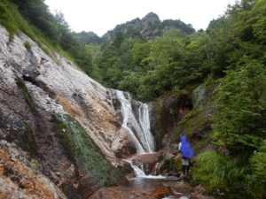 F13(10m)は手前の右岸に廃坑跡が見える特徴のある滝。正面遠景にはとがった岩山も見えて思わず写真をとりなくなる景色だ。ここ滝の中心付近バンド沿いを直登できる。