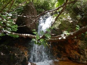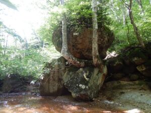 しばらく平坦な河原。右岸に巨岩を包んでいる木(ブナか?)がある場所を通り過ぎるとすぐにF1(8m)に到着。