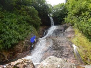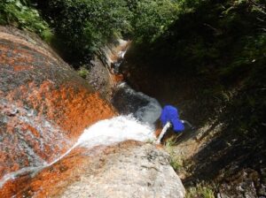 F11(4m)は難しくないが、右岸の壁がおもしろそうだったのでそちらを選択。普通は左岸から登ると思う。特徴的なF12(3段10m)は最上段のハング滝は下部のえぐれが以前よりかなり深く切れ込んでいると感じた。ここはいつ落ち口が崩壊しても不思議ではないと思う。上から眺めるときは注意が必要だ。