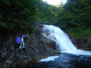 だが地形図にあるような良いポイントがなかなかない。地形図ではそれほど傾斜がないように見えるが、実際は急な斜面が続いている。意を決して登れそうな階段状の支沢の滝を登ることにした。難しくないように見えたが、ヌルと冷水で自分には今日最難関のクライミングとなった。