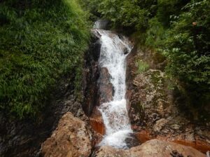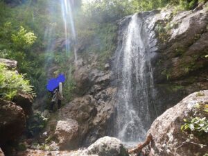 F1は一見登りにくいように見えるが、滝の右壁の植生沿いに登ることができる。