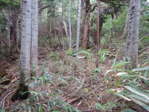 カラダが疲れているので、ちょっとしたササヤブも疲れにこたえる。無事鞍部到着し、ここでお昼休憩。鞍部はクマか何かの動物が広場として使っているようで、この周辺だけ木や草が倒れていた。
