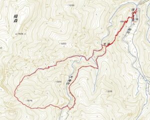 大滝沢出合駐車スペース発(6:34)→登山道→大滝沢降り口(7:06)→ホラ貝沢出合(7:40)→F5 30m滝(8:19)→F8 8m滝(9:41)→F14 10m滝(10:33)→F16 10m滝(10:47)→F17 10m滝(10:58)→終了の滝(11:10)→鞍部到着(11:29)→下降開始(11:59)→大滝沢到着(12:34)→右岸枝沢登攀(12:45)→登山道着(12:56)→大滝沢出合駐車スペース(14:04)