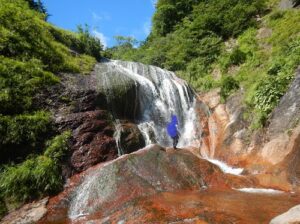 ボーリング跡のような穴からでる色違いの温泉の吹き出し口を過ぎるとF9(5m)になる。ここは右岸から巻く。