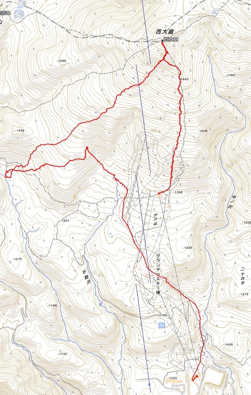 出発はゴンドラに乗るところから。 この日はいつもよりゴンドラの人は少なく、すぐにゴンドラに乗ることができた。ゴンドラを下り、そこからシール登高を開始する。第3リフトの下をジグを切りながら登る。リフト終点に到着すると、昨日までのスキー跡がたくさん確認できた。ここからゆっくりと西大巓を目指す。スキー場内では人が少なかったので、今日は西大巓を目指すパーティはいないのかと思っていたが、自分たちを含めて2、3パーティのあったので、思いのほか多いと感じた。そこからほかのパーティに追いついたり離れたりしているうちに、偽ピーク直下の1800m地点に到着。ここから偽ピークを登らず、左から縁(ふち)を巻くように登る。天気が良いので、巻いて偽ピークを右に見ながら登る。斜面から、下界のスキー場が綺麗に見えた。偽ピークを巻くところからスピードを上げ一気に頂上に到着。