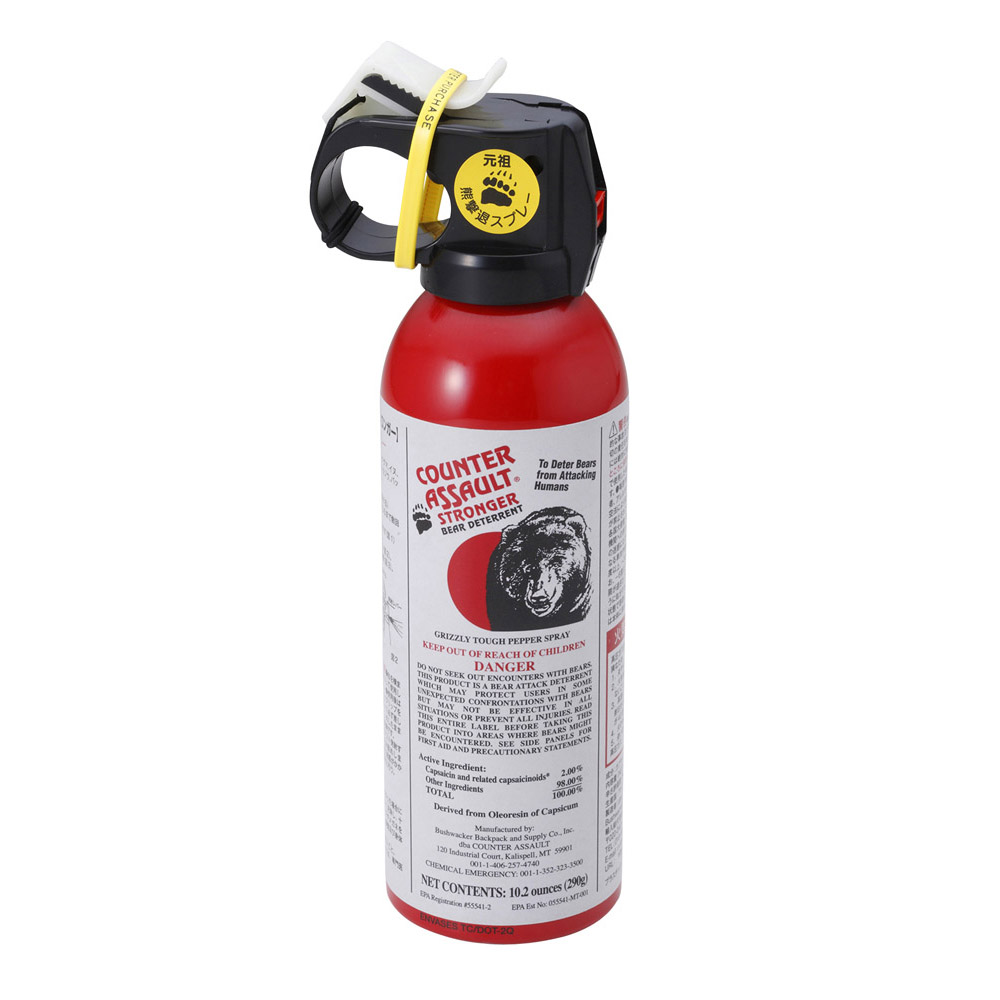 熊撃退スプレーでおすすめは「カウンターアソールト」。何度か使ったことがあるが、「飛距離」と試射時の「目に染みる感じ」はトップクラス。直接自分のからだにかかったらちょっとやばいかも・・。