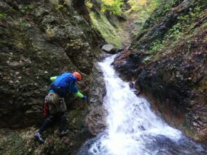 F9は30m滝である。以前登ったときはすんなり登れるように見えたが、今回はロープを出さないと危ないと感じた。以前の滝の写真と見比べると、流心左側の岩壁が登りやすくなっていたが、今は崩れたのか以前より壁が直立しているように見え、レベルがやや上がったと思われる。
