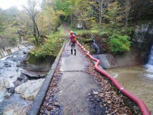 出発は甲子温泉「大黒屋」付近から出発する。近くには登山者向けの駐車場があるが、今は工事の現場管理棟があって面積が少なくなっている。現在は紅葉で車がいっぱいであったので、途中道路わきの空スペースにクルマを駐車し、そこから出発した。