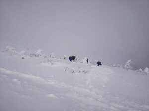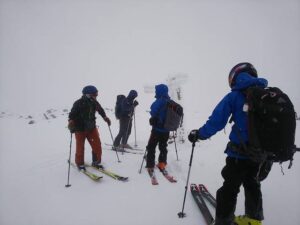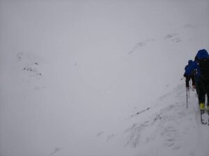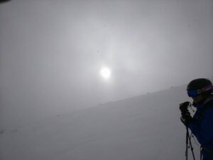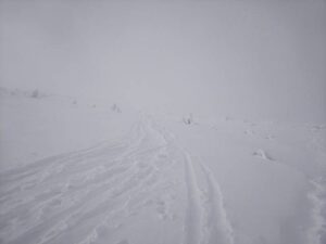 ▼山頂直下に到着 ホワイトアウトなので、シールをつけてしばらく下る