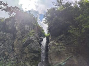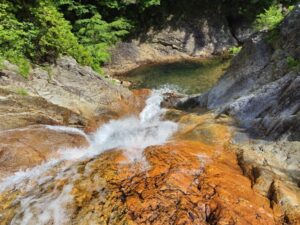 仲間内では大滝沢の遡行は多いが、なかなかここまで来ることは少ない。自分も沢登りでは実はまだ2度目だ。通常はネコノ沢かヒョングリ滝、桶木沢から登山道に戻ることが多い。潜滝からやや戻り、登山道との交差付近でお昼とする。大滝沢の水は酸っぱくて飲料には適さないが、自分は水を持ってきていなかったので、沢の水でカップラーメンを食べた。カップラーメンにすれば味はさほど問題なかった。ここからは登山道を下るだけだ。以前は登山道が荒れて竹などで埋もれていたが、今日は草刈りがキレイにされていて歩きやすい。草刈りの苦労に思いを馳せながら感謝して下る。滑川温泉付近に到着すると吊り橋が見える。災害で破損した吊り橋が有料の吊り橋として復活している。吊り橋を下ってもOKだが今回はもう少し下流に下り、前川を飛び石で横断した。雰囲気を味わいたいなら吊り橋がよいかもしれない。前川を横断し道路に到着し山行は終了。今日の下界の気温は30℃近いがまだ今の時期の沢は冷たかった。夏には水の温度も上がり泳ぎの渓になるのでまた訪れたいものだ。