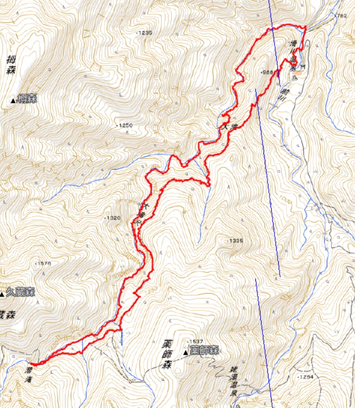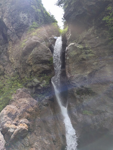 仲間内では大滝沢の遡行は多いが、なかなかここまで来ることは少ない。自分も沢登りでは実はまだ2度目だ。通常はネコノ沢かヒョングリ滝、桶木沢から登山道に戻ることが多い。潜滝からやや戻り、登山道との交差付近でお昼とする。大滝沢の水は酸っぱくて飲料には適さないが、自分は水を持ってきていなかったので、沢の水でカップラーメンを食べた。カップラーメンにすれば味はさほど問題なかった。ここからは登山道を下るだけだ。以前は登山道が荒れて竹などで埋もれていたが、今日は草刈りがキレイにされていて歩きやすい。草刈りの苦労に思いを馳せながら感謝して下る。滑川温泉付近に到着すると吊り橋が見える。災害で破損した吊り橋が有料の吊り橋として復活している。吊り橋を下ってもOKだが今回はもう少し下流に下り、前川を飛び石で横断した。雰囲気を味わいたいなら吊り橋がよいかもしれない。前川を横断し道路に到着し山行は終了。今日の下界の気温は30℃近いがまだ今の時期の沢は冷たかった。夏には水の温度も上がり泳ぎの渓になるのでまた訪れたいものだ。