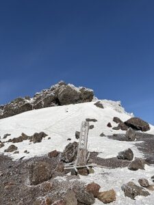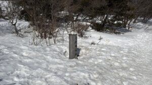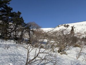1600mのコンタからは緩やかな斜面が続く。ここから風が強くなるので準備は万全に。また山頂の岩屋周辺は雪が着いていないこともある。