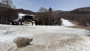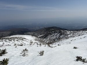五葉松平からゲレンデまでは、登山道のスキーヤーから見た右側の沢か、左側の林間部が快適だ。この斜面を下れば、あとはゲレンデを滑って奥岳登山口でゴールになる。