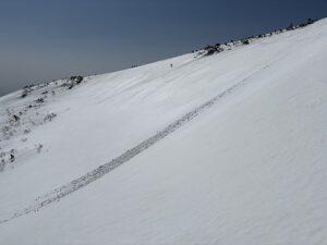 安達太良山では、特に雪が降っているときは雪崩が起きやすい。源頭まで一気に下ったら、右の夏道寄りの斜面をトラバース気味に滑走すると、五葉松平の登山道まで止まらずたどりつける。楽しいからといって烏川の中を進むと、途中でシールを着けて登るようになる。