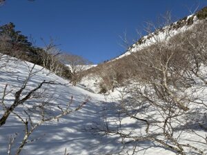 ここは正面からの登高より、やや左寄りの小尾根から巻くように登ると、緩やかで雪崩リスクも軽減できる。