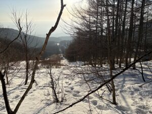 スタートは奥岳登山口から登山道を進む。登山道は踏み跡がしっかりしていることが多く、迷ったりラッセルするようなことは少ない。ゲレンデの一番右、ベガコースのトップから五葉松平に乗る。