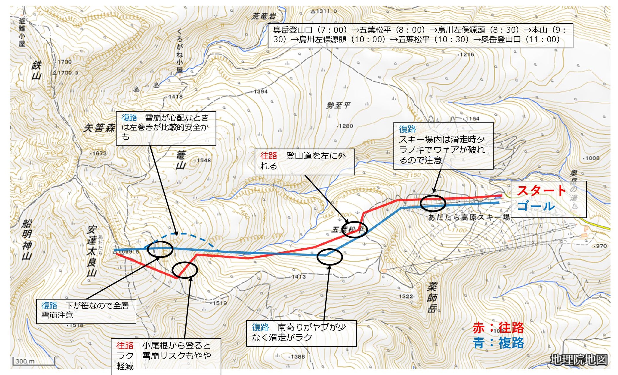 安達太良山では、特に雪が降っているときは雪崩が起きやすい。源頭まで一気に下ったら、右の夏道寄りの斜面をトラバース気味に滑走すると、五葉松平の登山道まで止まらずたどりつける。楽しいからといって烏川の中を進むと、途中でシールを着けて登るようになる。